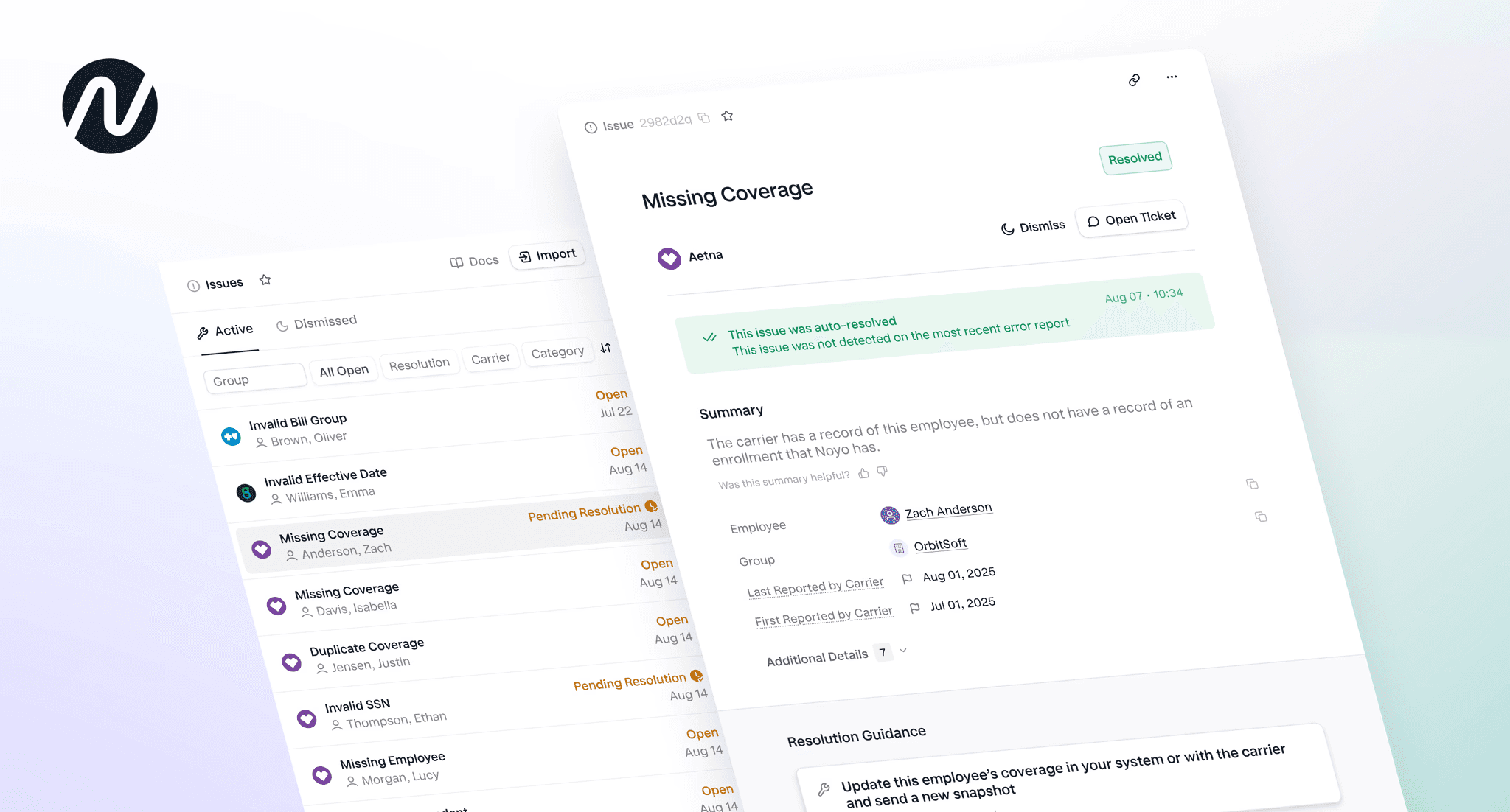 Noyo Feeds delivers full visibility into EDI transmissions, giving ben-admins a clear, auditable view of what data was sent and scheduled, complete with up-to-date statuses and timelines.The enhanced Issues experience is now broadly available