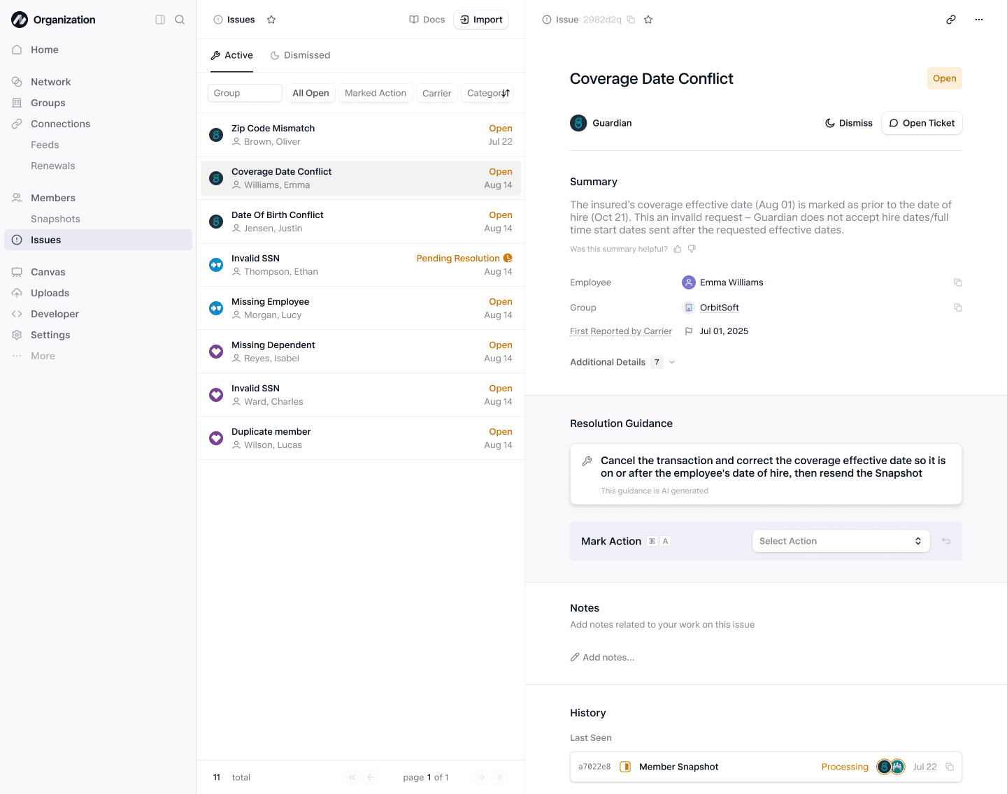 We’ve expanded our Issue tracking experience to support automatic Issue creation from Guardian API transmissions. This update improves visibility into common validation problems that can prevent enrollment and eligibility changes from being successfully processed.