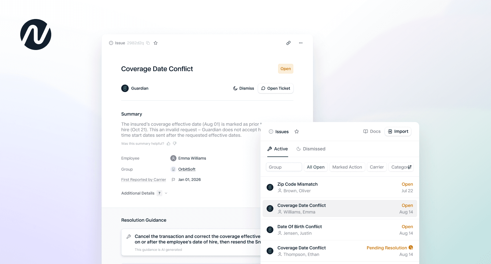 Noyo now automatically creates Issues from Guardian API errors, giving teams immediate visibility into data issues that block enrollment and eligibility changes.