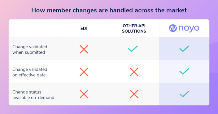 Instead of file-based workflows, ben-admins send member changes to our API endpoints for managing enrollment and eligibility. For every change that’s submitted to the Noyo API, round-trip confirmation provides two checks: